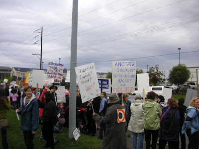 My parents and brother were in town for my Dad's birthday, and one of the things they really wanted to do was to go to the anti-Palin rally held infront of the library on Saturday afternoon. Emily heard about it via an email, but it was also mentioned in the paper. We thought maybe 10 or 100 people might show up. When we showed up there were at least 500 people. The news reported that 1,000 people attended. There were a few pro-Palin fools, but for the most part it was a bunch of fired up Obama-ites. We saw a few of our fellow Obama volunteers, and Emily saw a bunch of people she knew from swimming and work. It was great! Cars would honk as they drove by.